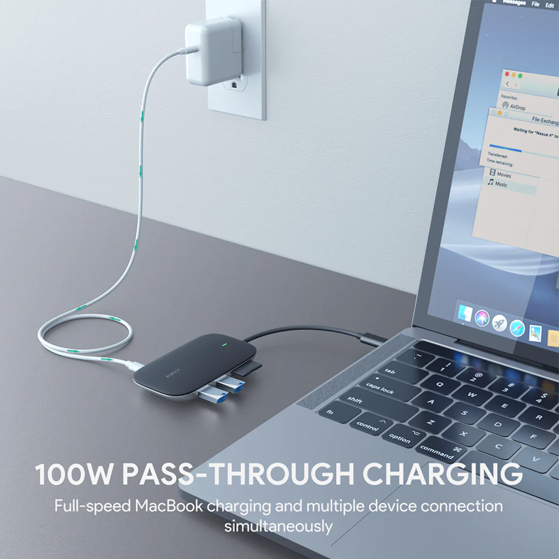 The 100W USB Power Delivery port keeps your MacBook or other compatible USB-C PD laptop or phone fully charged (using your device’s original power adapter) while you’re using all the other functions of the hub.