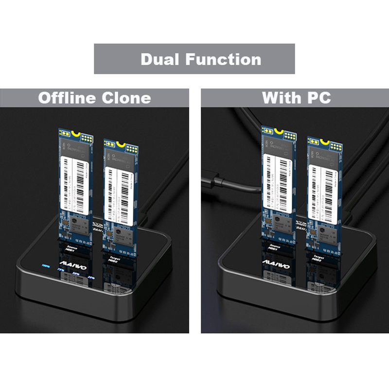 -10GBP/S HIGH-SPEED: MAIWO USB 3.2 Gen2 hard disk docking station is equipped with C to C cable and C to A cable, the fastest transmission speed can reach about 1000MB/S.