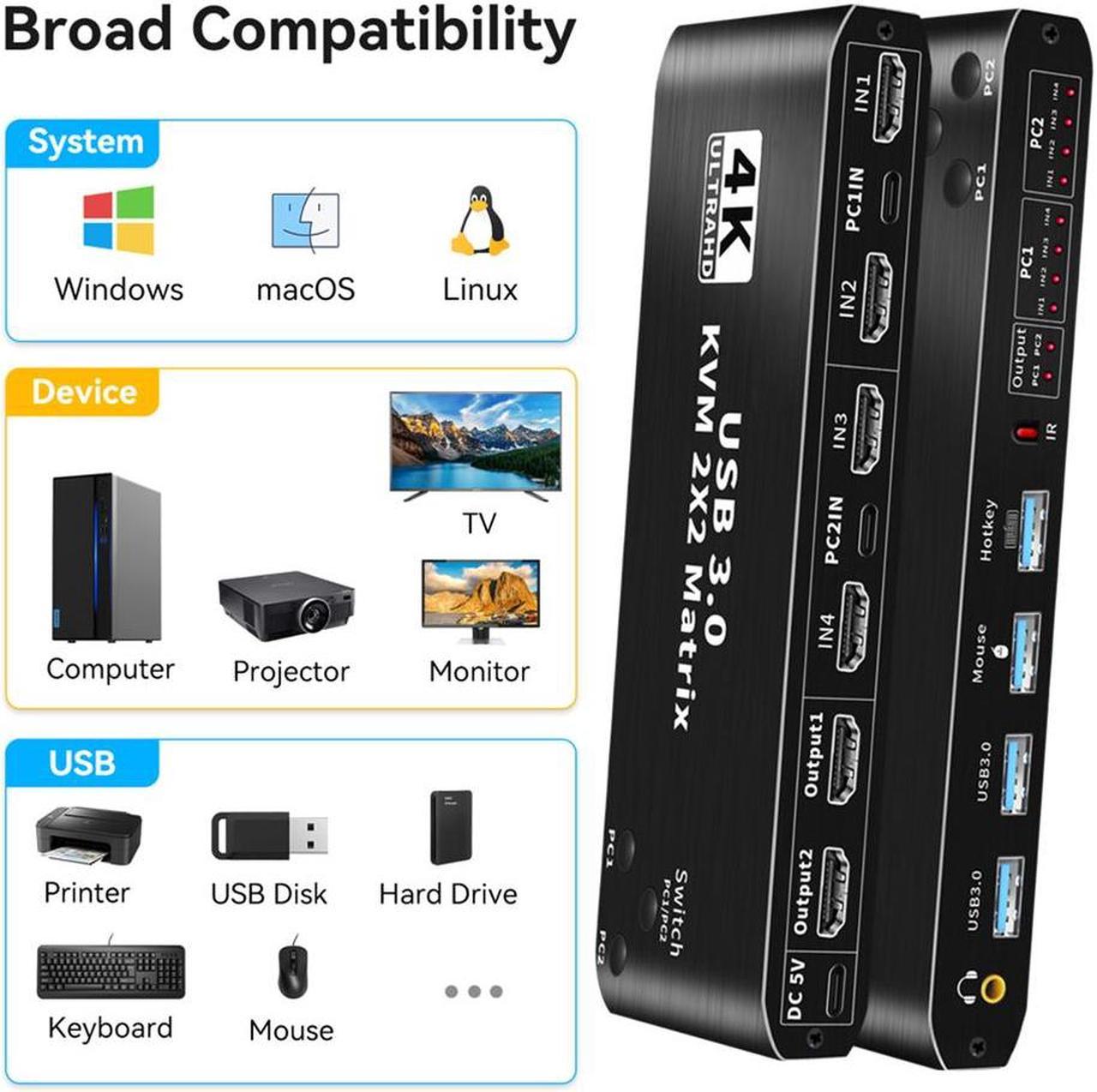 2 In 2 Out 4K USB 3.0 HDMI KVM Switch Matrix Box dual monitor for 2 PC Sharing Keyboard Mouse Printer Plug Play Video 2 Display USB Switch Splitter